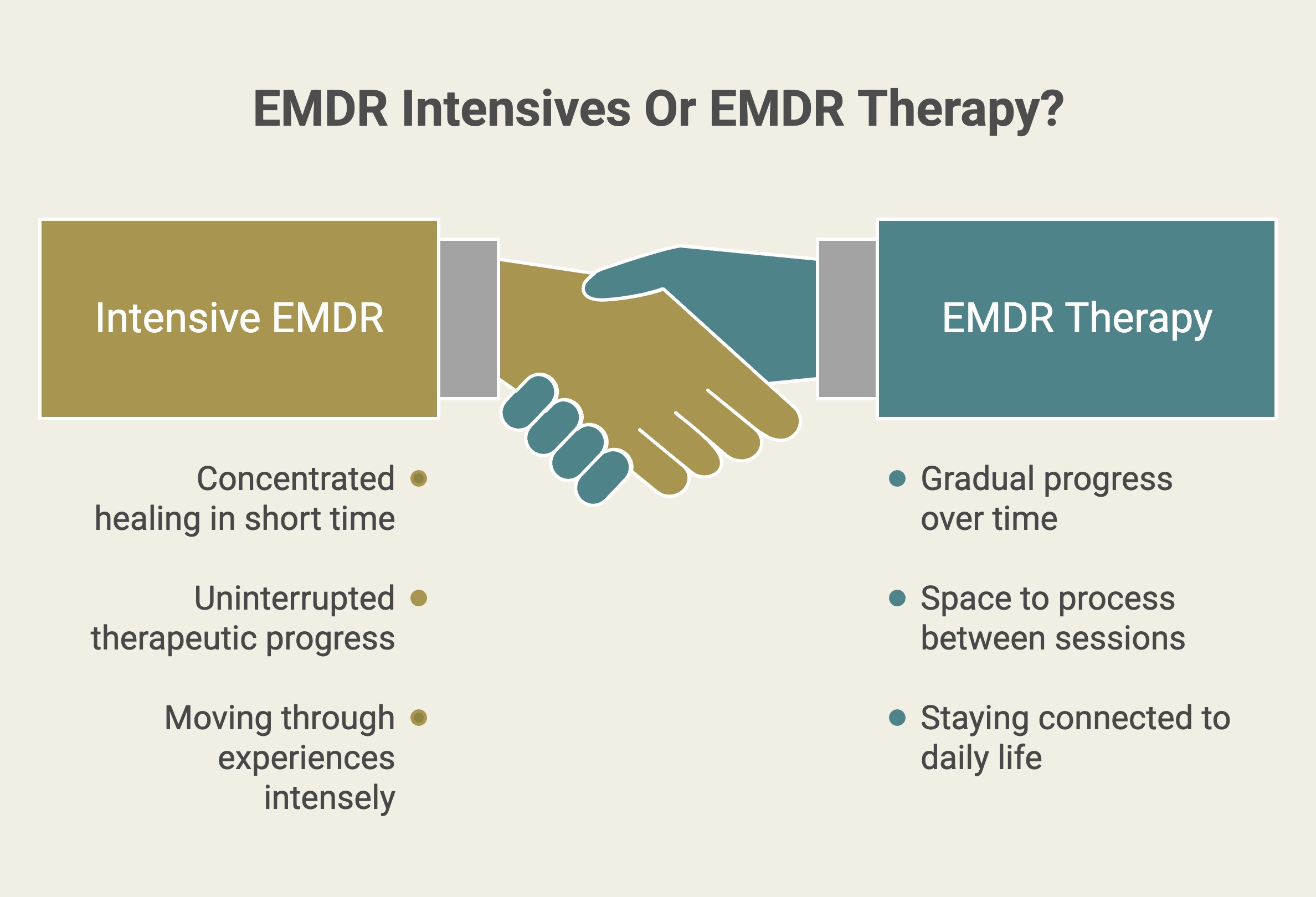 EMDR intensives are best when you want to focus deeply in a shorter period of time, while weekly EMDR sessions are better when you prefer a steady pace with time between sessions.